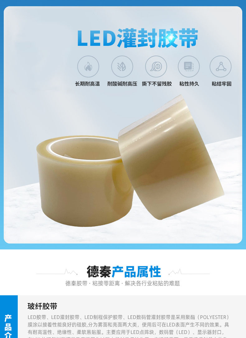 适用范围 主要应用于LED点阵块,数码管(LED)、显示器封口,在LED的环氧树脂灌装及高温固化过程中起封口保护